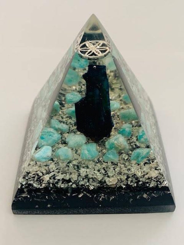Iedere orgonite piramide is een uniek exemplaar met natuurlijke mineralen, orgonite (Via een alchemistisch recept van Kwartskristallen, Groene toermalijn, Aluminium met Shungite), en een koperspiraal in cubit maat, gegoten in giethars