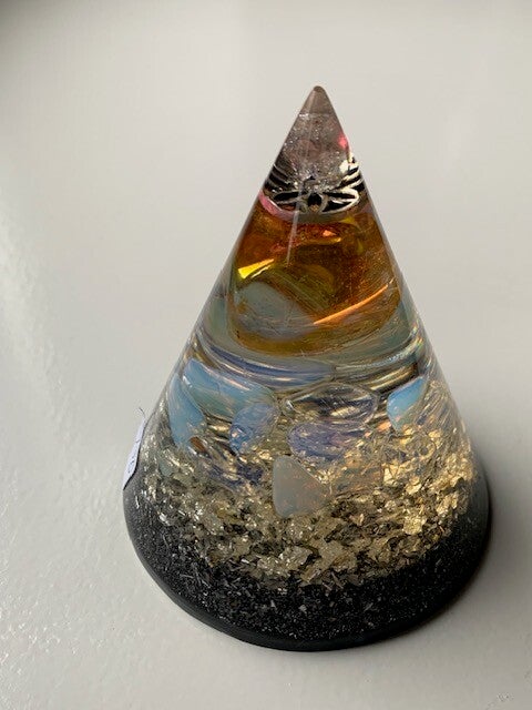 Orgonite Kegel of conus Golden Aura Kwarts, Opaliet, Satya Mani Azeztuliet, Flower of Life, Shungite, Herkimeriamant, Dubbeleinder, Zilver