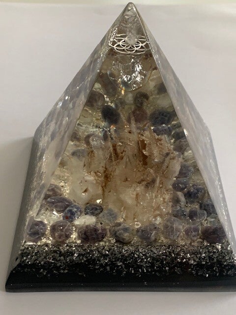 Nubische Orgonite Piramide Ioliet, Magnesiet op Kwarts, Flower of Life,Fire and Icekwarts bol, Shungite, Herkimerdiamant, Dubbeleinder, Zilver