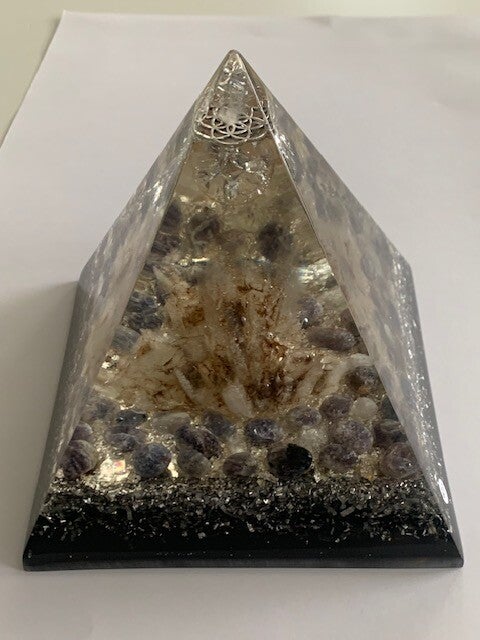 Iedere orgonite piramide is een uniek exemplaar met natuurlijke mineralen, orgonite (Via een alchemistisch recept van Kwartskristallen, Groene toermalijn, Aluminium met Shungite), en een koperspiraal in cubit maat, gegoten in giethars.