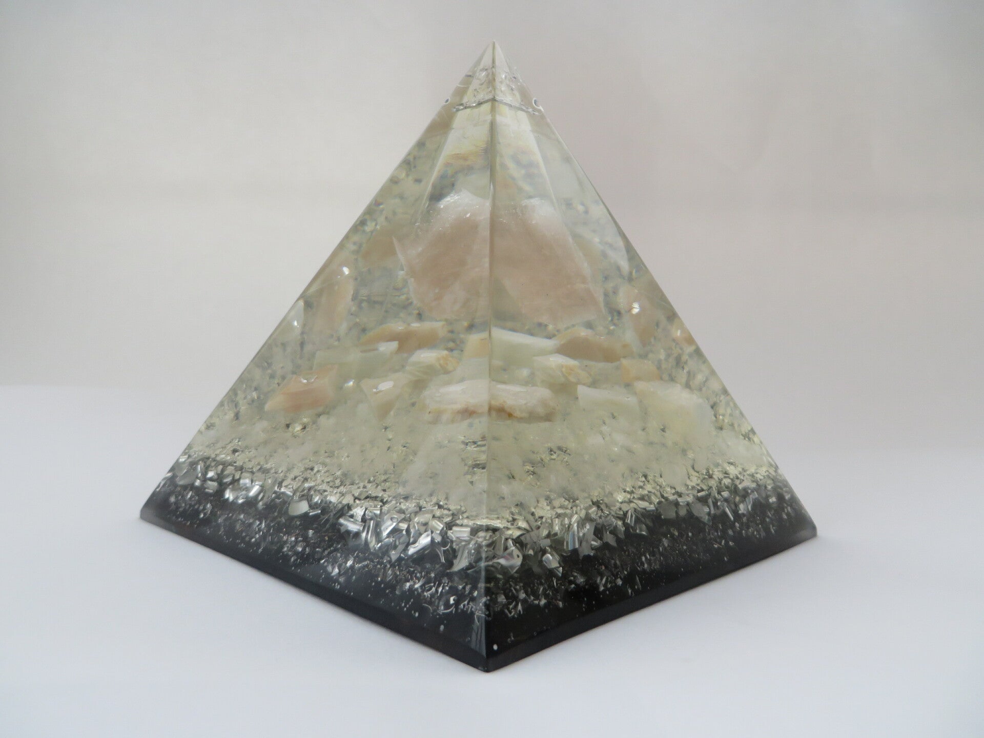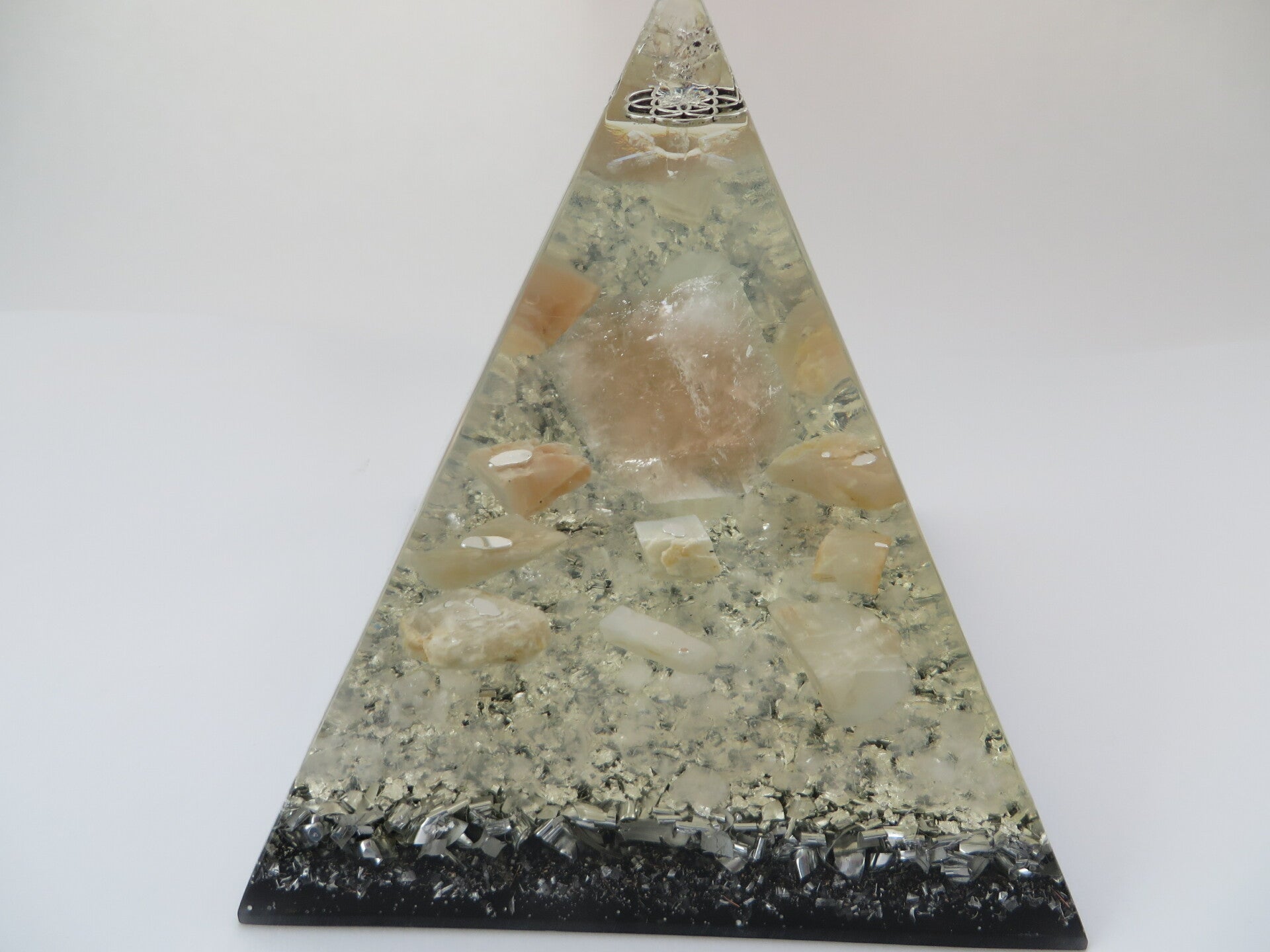 Omschrijving Nubische Piramide Helder Roze calciet Maansteen Bergkristal Orgonite Levensbloem Herkimediamant Dubbeleinders Bladzilver Afmeting 14x14x15,5 cm