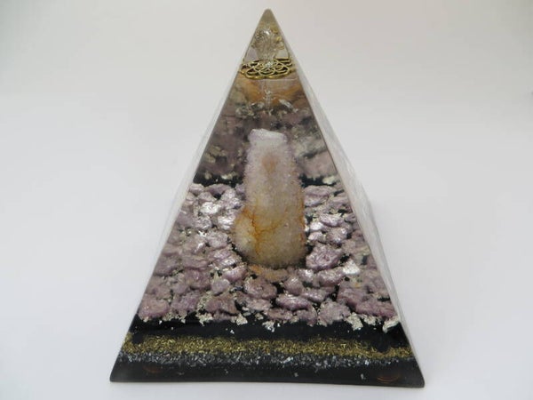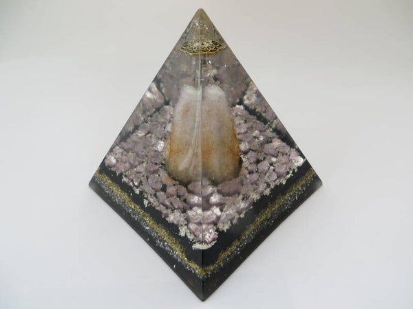 Nubische Piramide AmethistZielskwarts Lepidoliet Zwarte toermalijn Orgonite Levensbloem Herkimerdiamant Dubbeleinders Bladgoud Afmeting 12,5x12,5 cm 14 cm