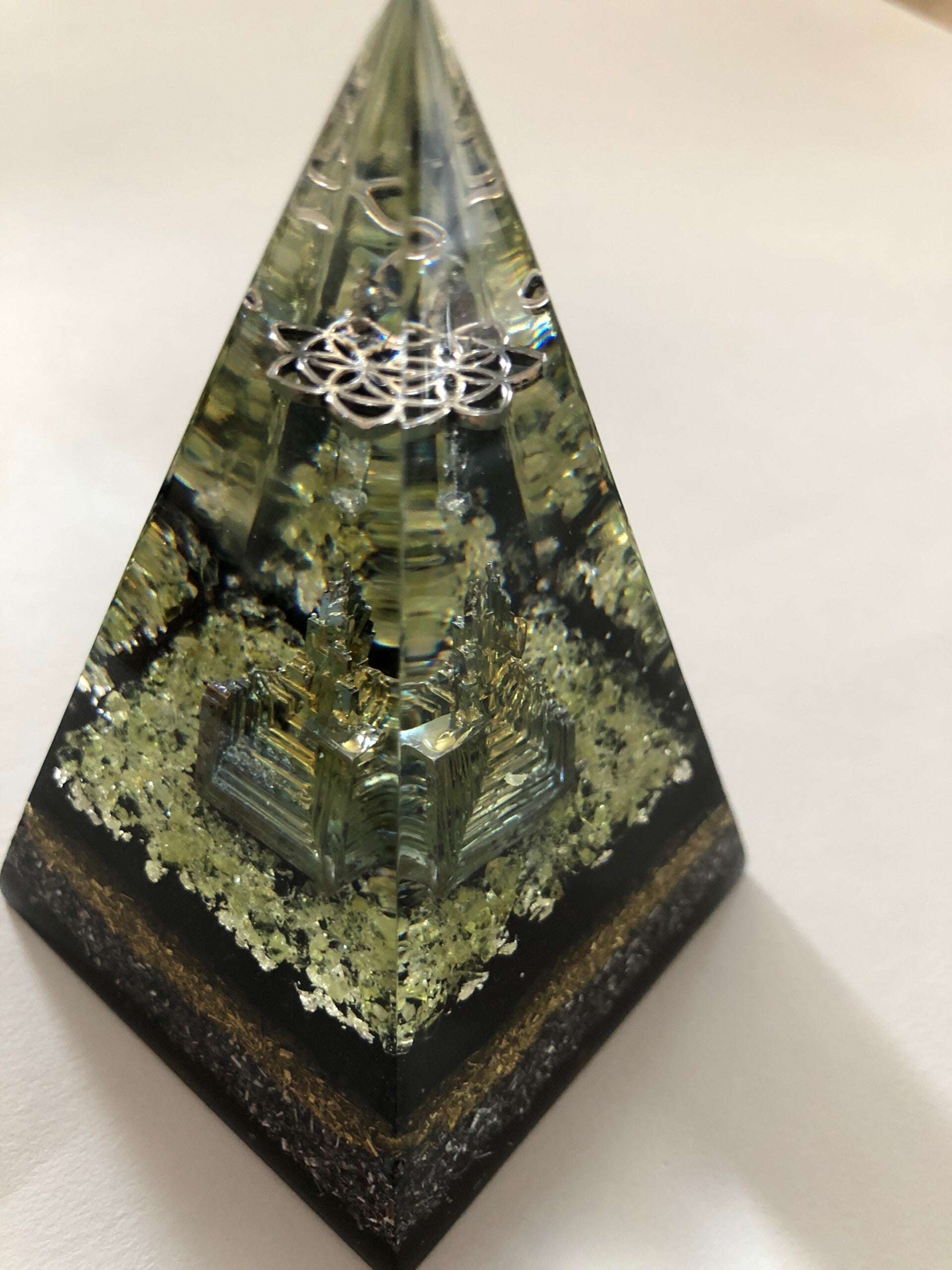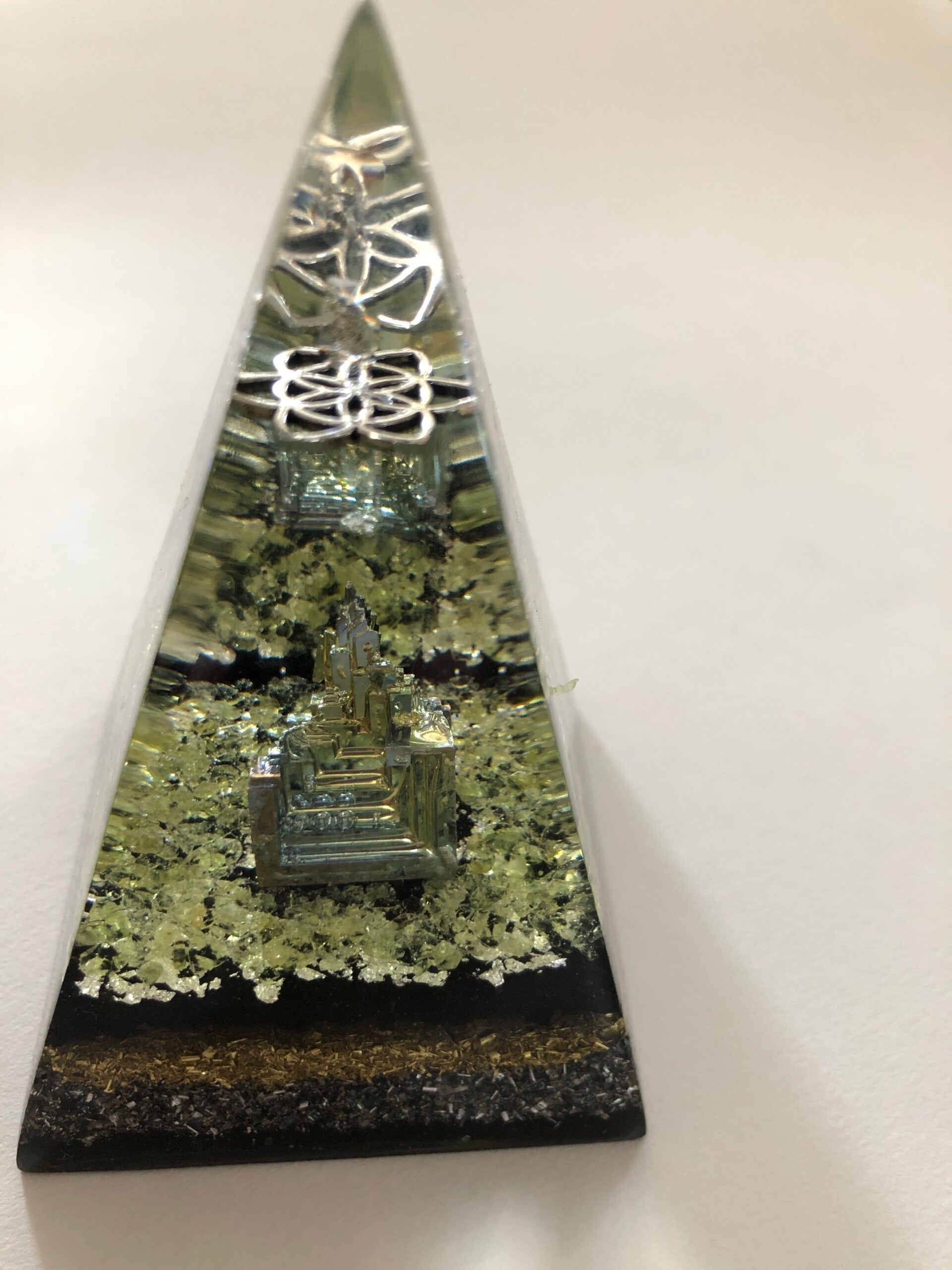 Russische Piramide Olivijn Bismuth Zwarte Toermalijn Levensbloem Orgonite Herkimerdiamant Dubbeleinder Bladzilver Afmeting 6 x 6cm x 10 cm