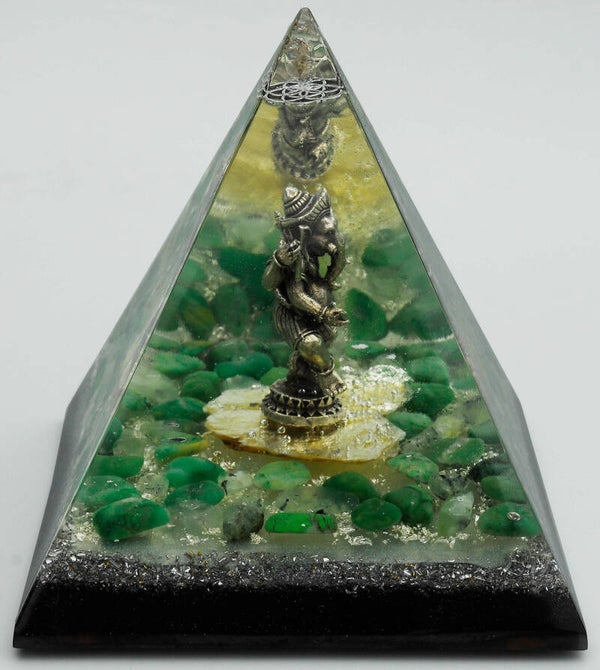 Nubische Piramide Orgonite Jade met Chrysopaas Olivijn Muscoviet Ganesha Flower of life Herkimerdiament Dubbeleinder Bladzilver