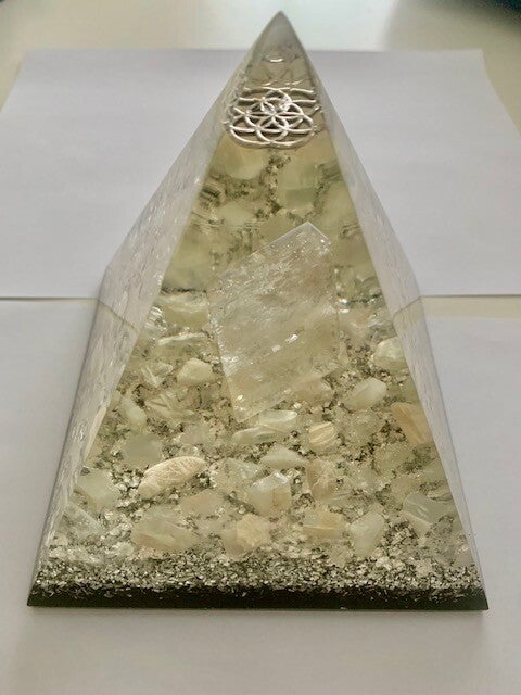 Nubische Orgonite Piramide Maansteen, Roze Calciet(Mangano),Bergkristal, Shungite, Flower of Life, Herkimerdiamant, Dubbeleinder, Zilver