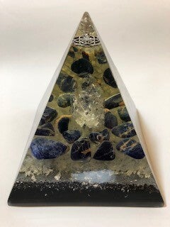 Nubische Orgonite Piramide Sunset Sodaliet Bergkristal Fire and Ice kristal Shungite Levensbloem Herkimerdiamant Dubbeleinder Bladzilver