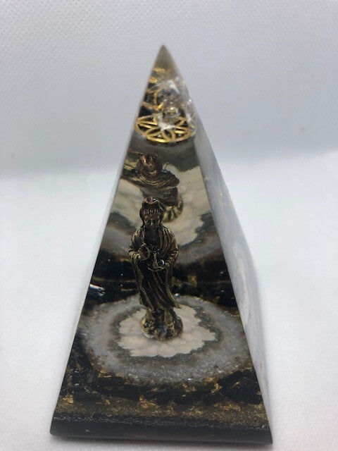 Kleine Rusische Orgonite Piramide Kwan Yin Stalagtiet Toermalijn Zwart Flower of Life Herkimerdiamant Dubbeleinder Bladgoud