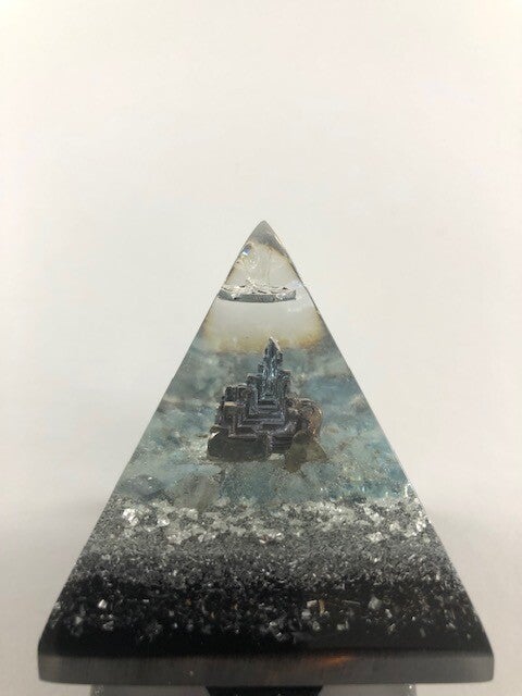 Kleine Nubische Orgonite Piramide Bismuth Aquamarijn Shungite Herkimerdiamant Dubbeleinder Zilver