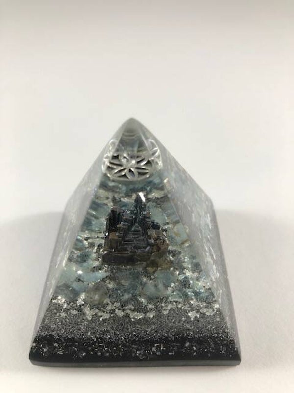 Iedere orgonite piramide is een uniek exemplaar met natuurlijke mineralen, orgonite (Via een alchemistisch recept van Kwartskristallen, Groene toermalijn, Aluminium met Shungite), en een koperspiraal in cubit maat, gegoten in giethars.